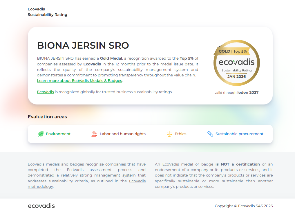 BIONA JERSÍN s.r.o. hat die neueste EcoVadis-Nachhaltigkeitsbewertung erfolgreich abgeschlossen, eines der weltweit anerkanntesten Systeme zur Bewertung der unternehmerischen Nachhaltigkeitsleistung. Infolgedessen wurde dem Unternehmen die EcoVadis Goldmedaille verliehen, die ein hohes Niveau des Nachhaltigkeitsmanagements in den zentralen Geschäftsbereichen bestätigt.